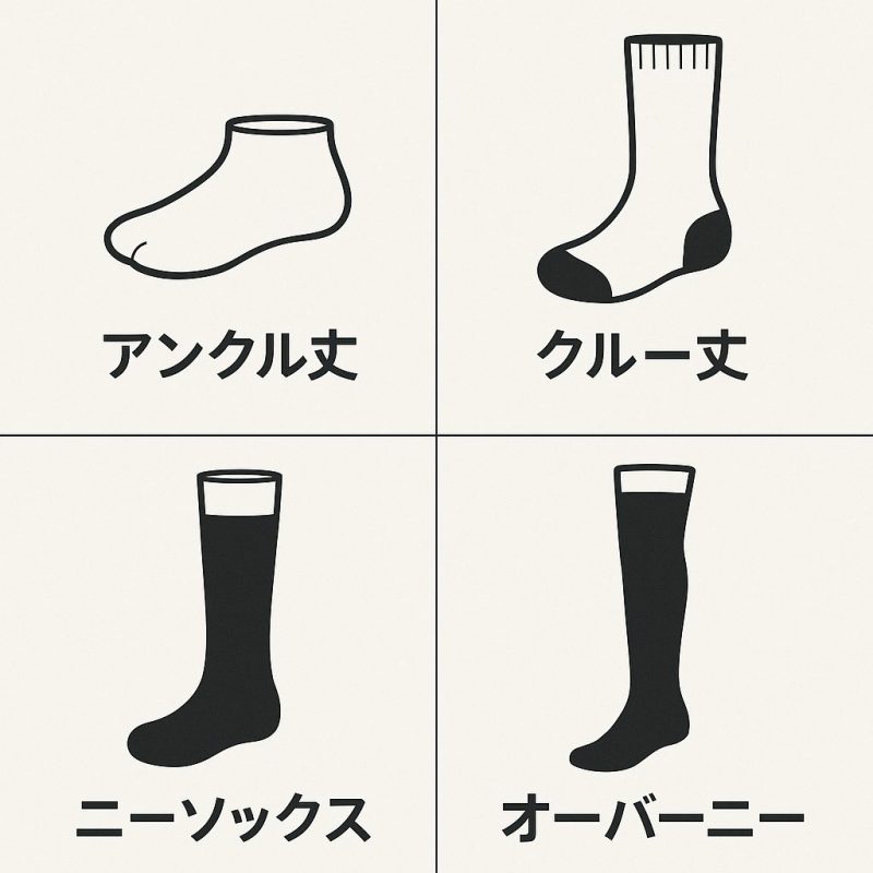 アンクル丈、クルー丈、ハイソックス丈(ニーソックス)、オーバーニーの